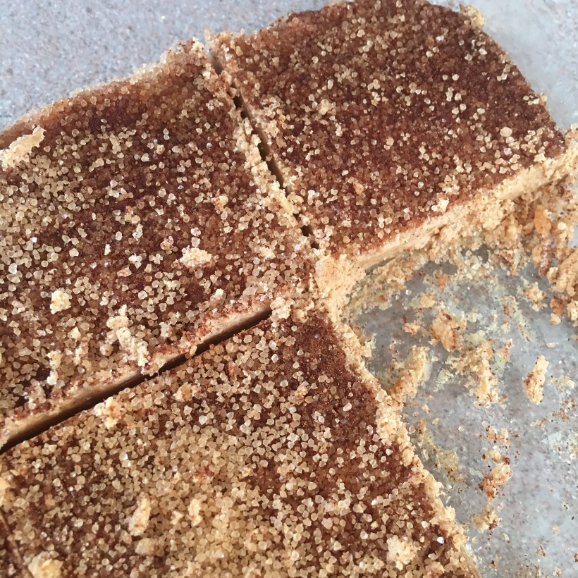 Combine cinnamon sugar mixture ingredients in a bowl, then sprinkle half on bottom of an 8×8 dish and set aside. In separate bowl combine main part ingredients, then pour over the half of the cinnamon sugar mixture in the 8×8. Sprinkle remaining half cinnamon sugar mixture over the main part as topping. Place in freezer for at least 4 hours or overnight. Cut into squares and serve, store in refrigerator.